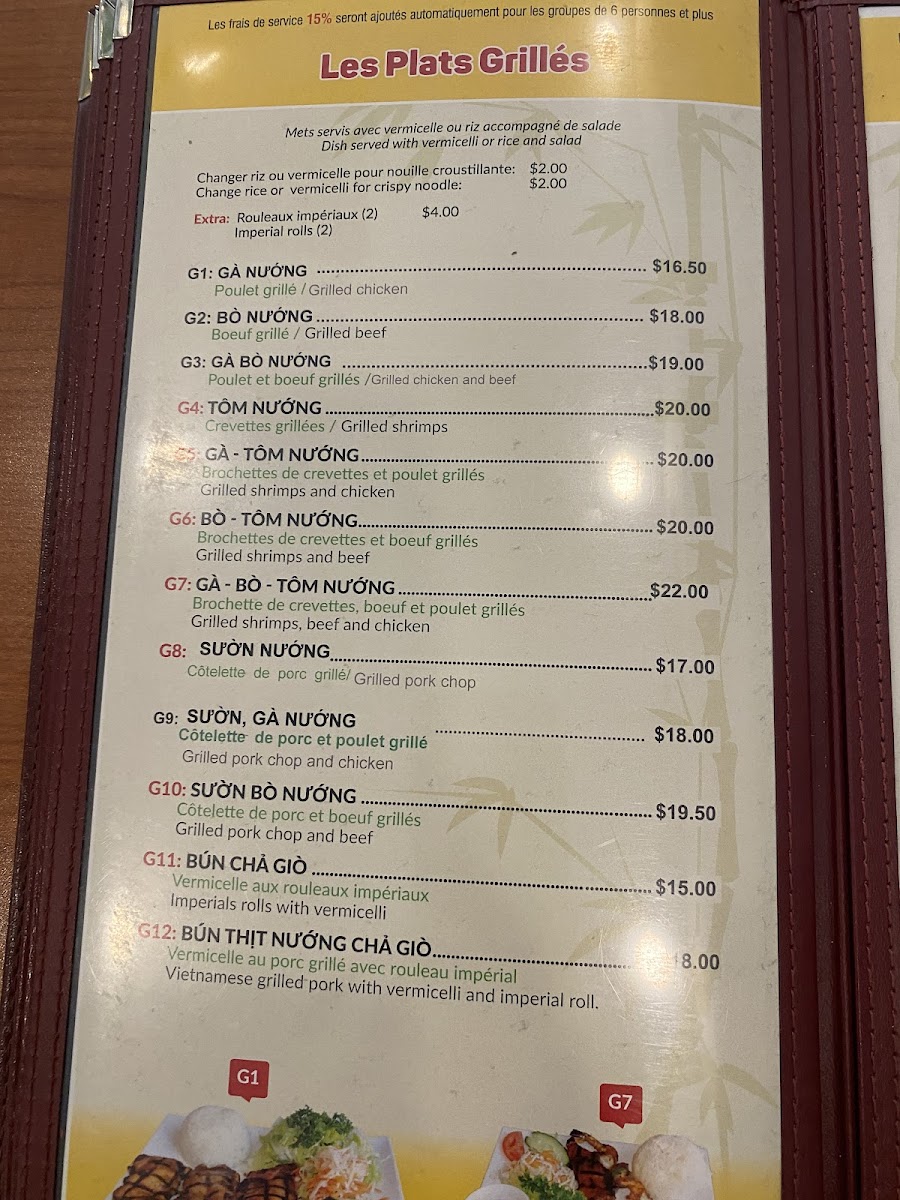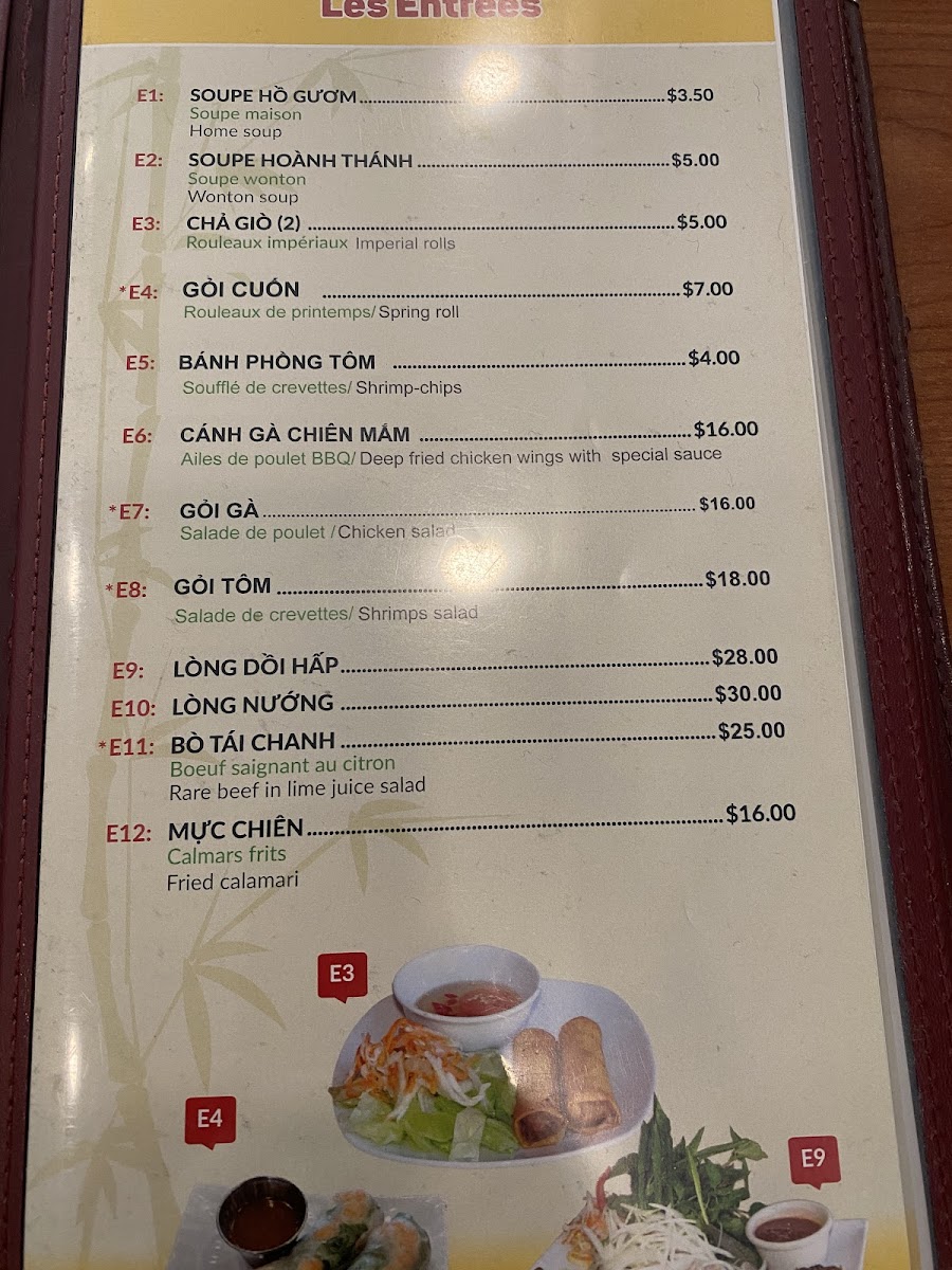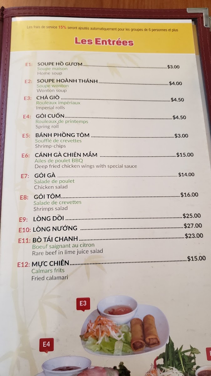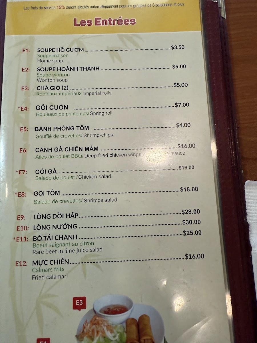 Introducing the menu at Restaurant Ho Guom is a culinary journey through authentic Northern Vietnamese cuisine. Located at 2605 Rue Jean-Talon E in Montreal, this restaurant delights patrons with its flavorful offerings and attentive service. The menu boasts an array of tantalizing options, from crispy chicken wings (Canh Ga Chien Mam - CA$16) to refreshing chicken salad (Goi Ga - CA$16), ensuring there's something for everyone.
