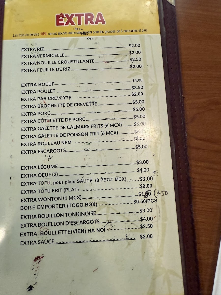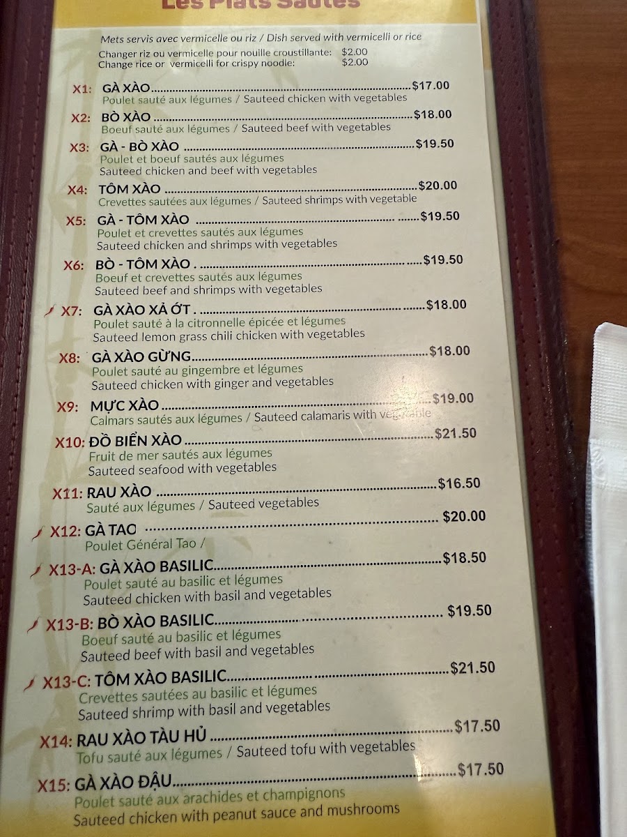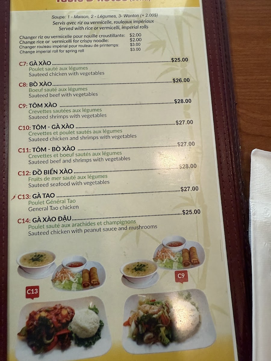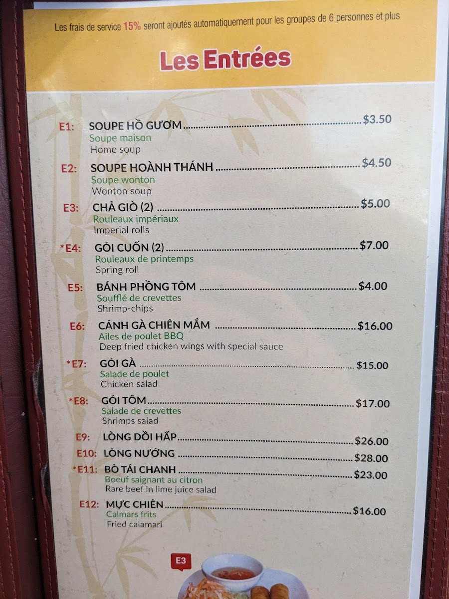 Introducing the menu at Restaurant Ho Guom is a culinary journey through authentic Northern Vietnamese cuisine. Located at 2605 Rue Jean-Talon E in Montreal, this restaurant delights patrons with its flavorful offerings and attentive service. The menu boasts an array of tantalizing options, from crispy chicken wings (Canh Ga Chien Mam - CA$16) to refreshing chicken salad (Goi Ga - CA$16), ensuring there's something for everyone.